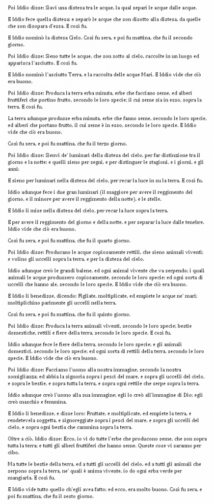 Giusto per incuriosire un po’ il lettore e spingerlo a procurarsi una copia (cartacea, vera) della Bibbia, dove si possono leggere, anche se non credenti, storie interessanti, alcune delle quali certificate storicamente da documenti, proponiamo di seguito l’inizio dell’Antico Testamento, la prima pagina della Bibbia.